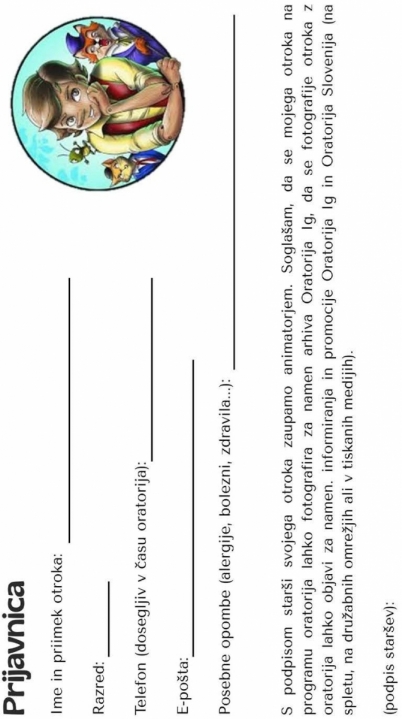 POMEMBNE INFORMACIJE: za hrano bo poskrbljeno; s seboj prinesite vodo; prispevek je 5€ na udeleženca; animatorji si pridržujemo pravico, da se program lahko spremeni; otroci, ne pozabite, da na oratoriju upoštevamo animatorje in se lepo obnašamo do drugih udeležencev!
